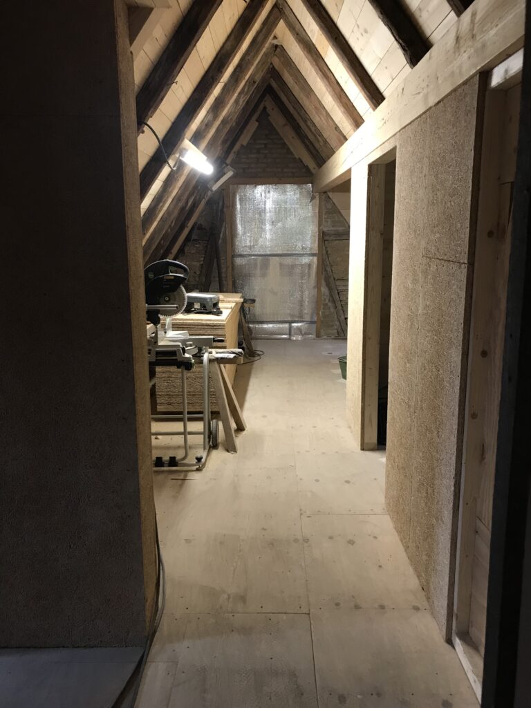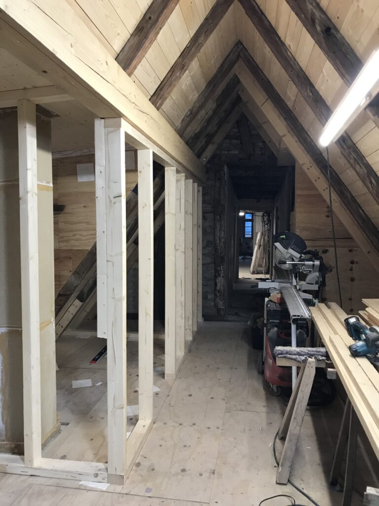 Die Holzständer für die Innenwände in der DG-Wohnung werden gestellt.