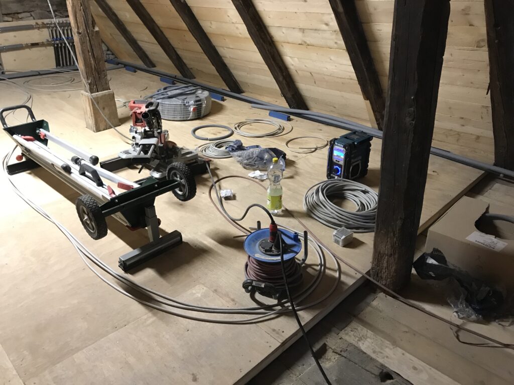 Um in der DG-Wohnung so wenig wie möglich in die Substanz einzugreifen und die Decken nicht unnötig abhängen zu müssen verlegen wir die Heizstränge auf dem Dachboden und führen sie an den passenden Stellen durch die Decke nach unten in die Wohnung.