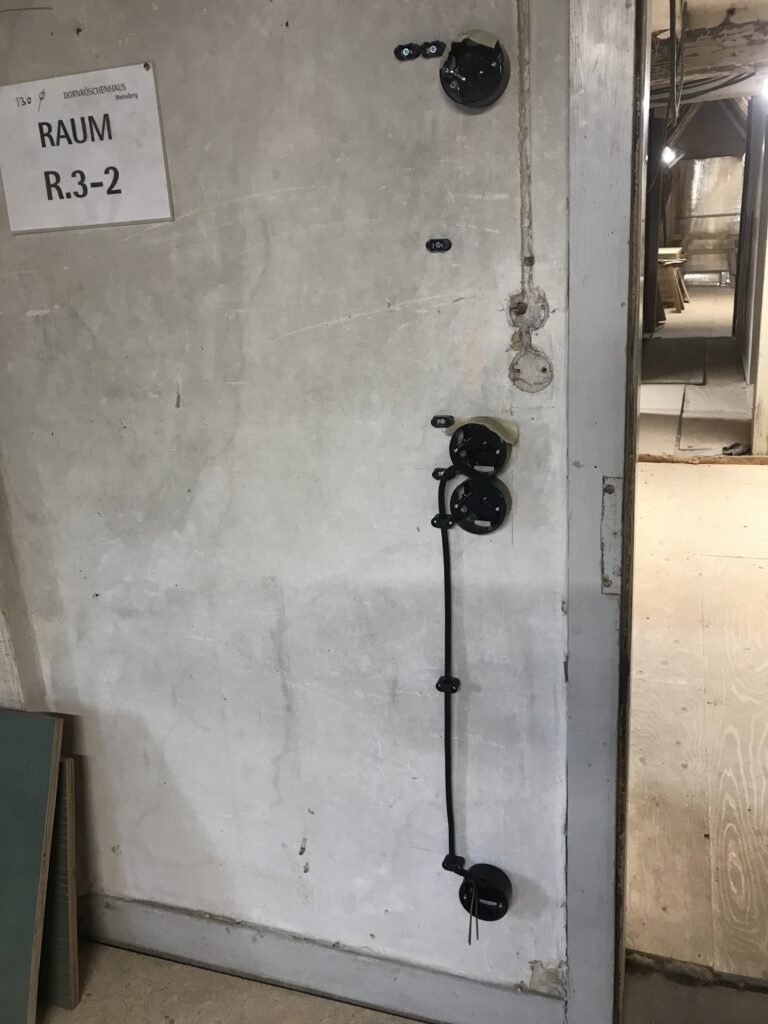 Der Elektriker beginnt mit der Installation in der DG-Wohnung. er legt fachmännisch die Aufputzleitungen mit Textilkabel in der Stube.