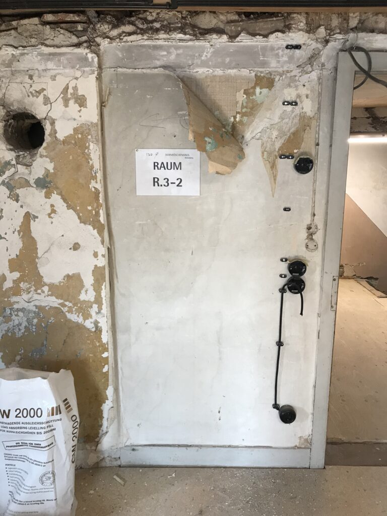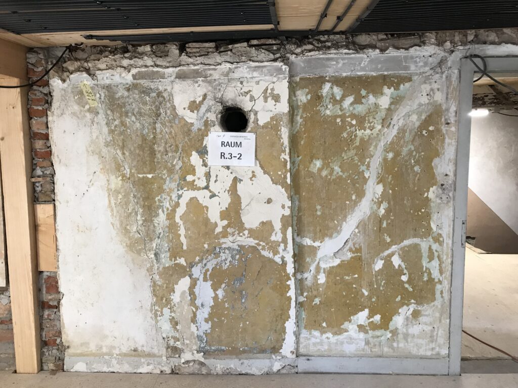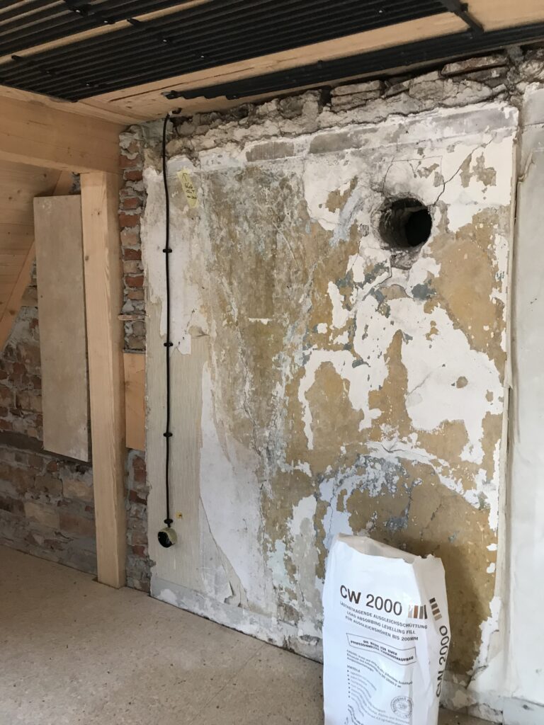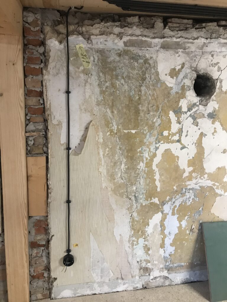 aber aber die Wand ist doch noch gar nicht fertig! Eigentlich sollte nur der Zugang von oben gelegt werden, das Kabel durchgeführt aufgerollt und verpackt. Hier kommen doch noch die Gipser. Und die Tapete musste auch noch weg. Darunter kam dieser tolle ockerfarbton zum Vorschein. 10. April 2025