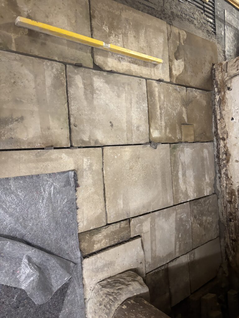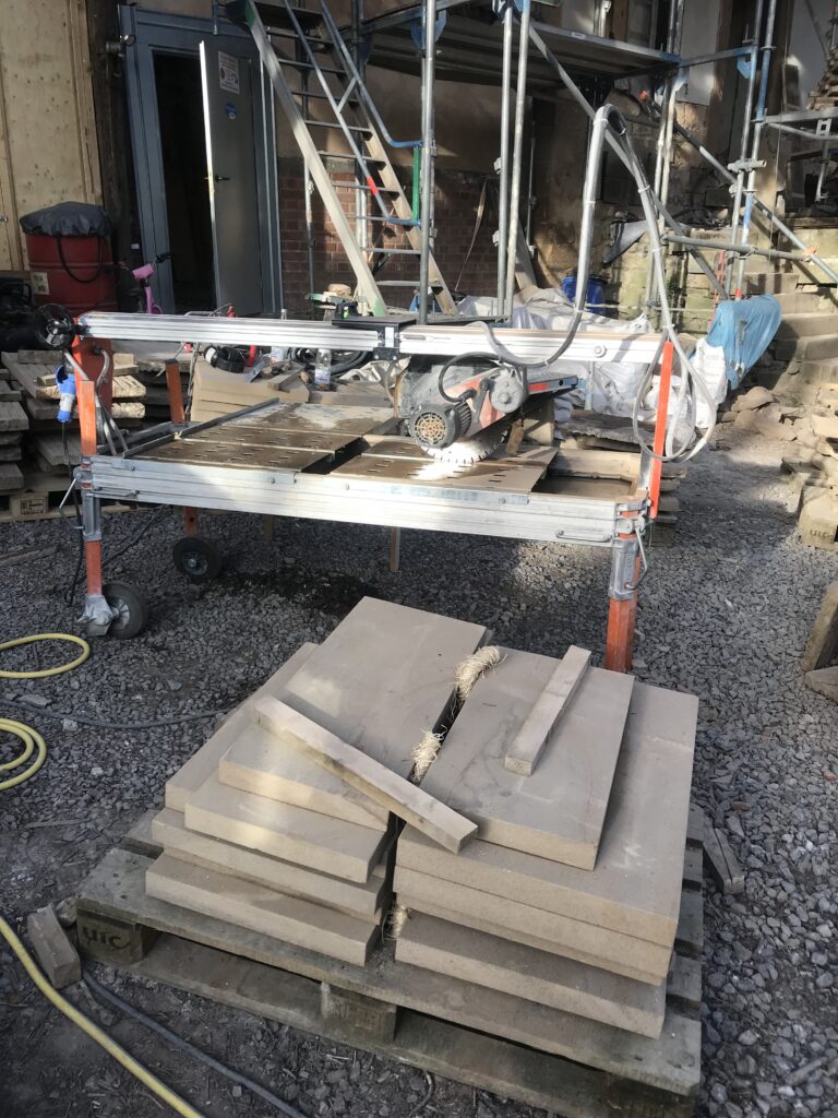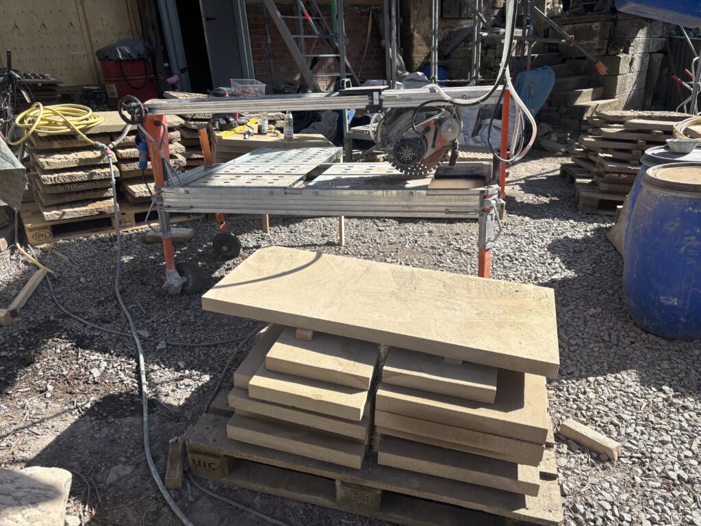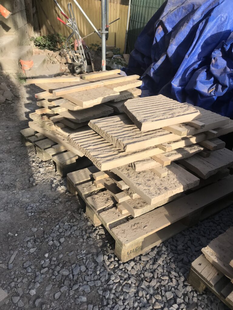 07.04.2025: Die alten gekennzeichneten Sandsteine kommen zurück. Dazu ein paar „Neue“ um die kaputten Steine ersetzen zu können. Die Steine müssen teilweise auf der Unterseite nochmals nachbearbeitet werden.
