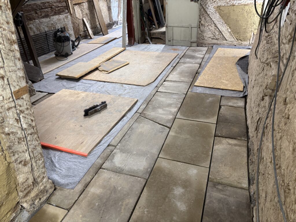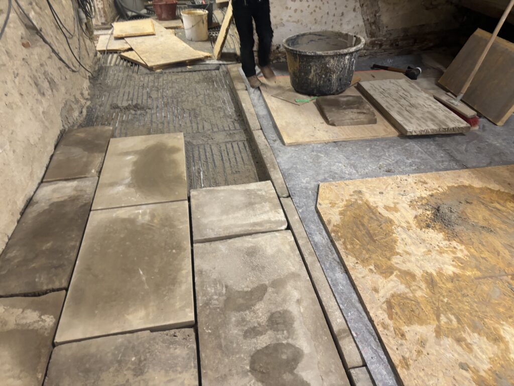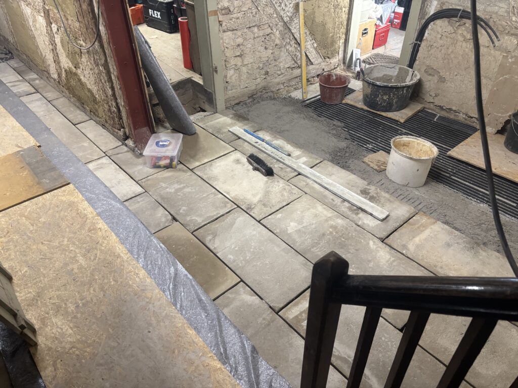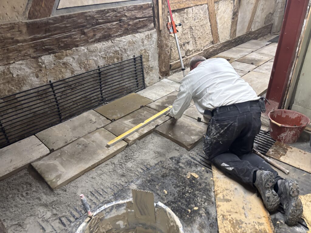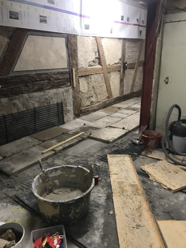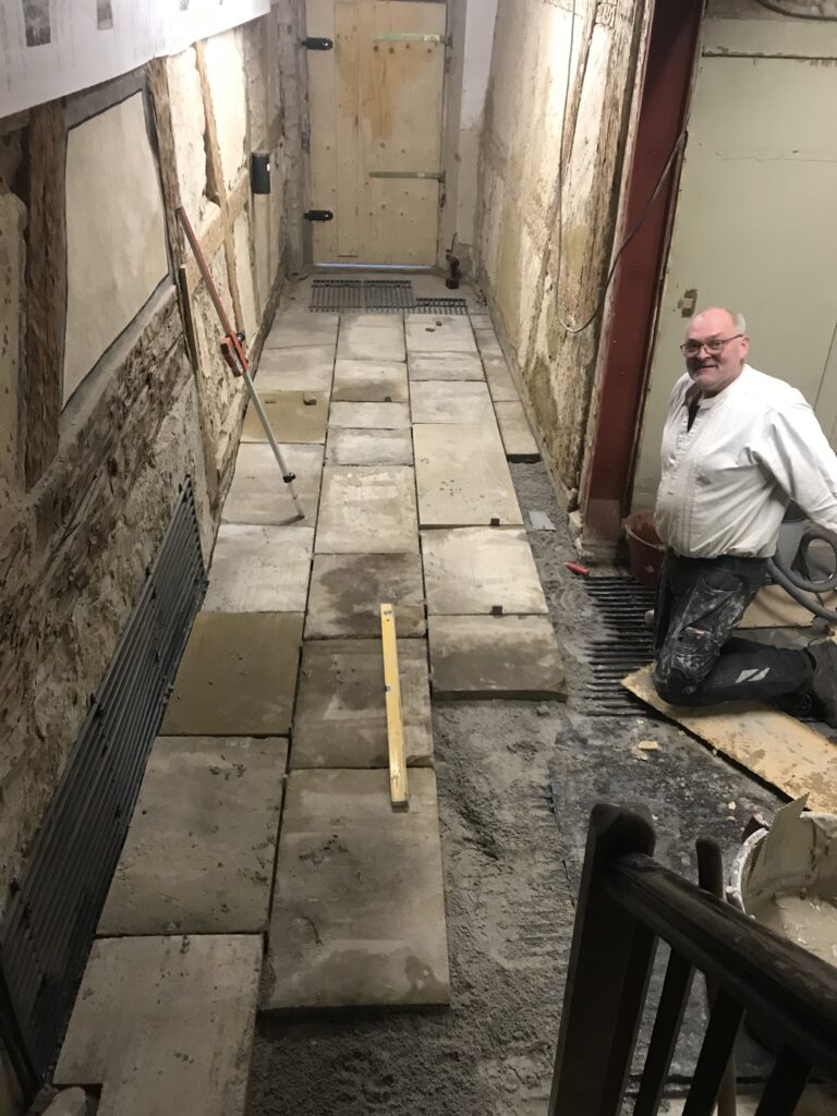 Von dort aus arbeiten die Beiden sich immer weiter vor bis der gesamte Flur wieder mit dem neuenalten Boden belegt ist. Nun fehlt nur noch das Verfugen.