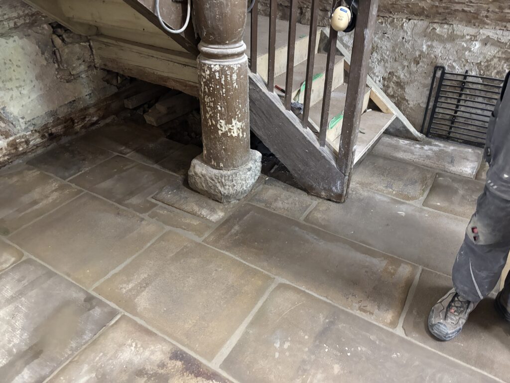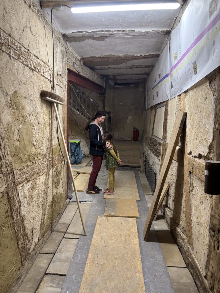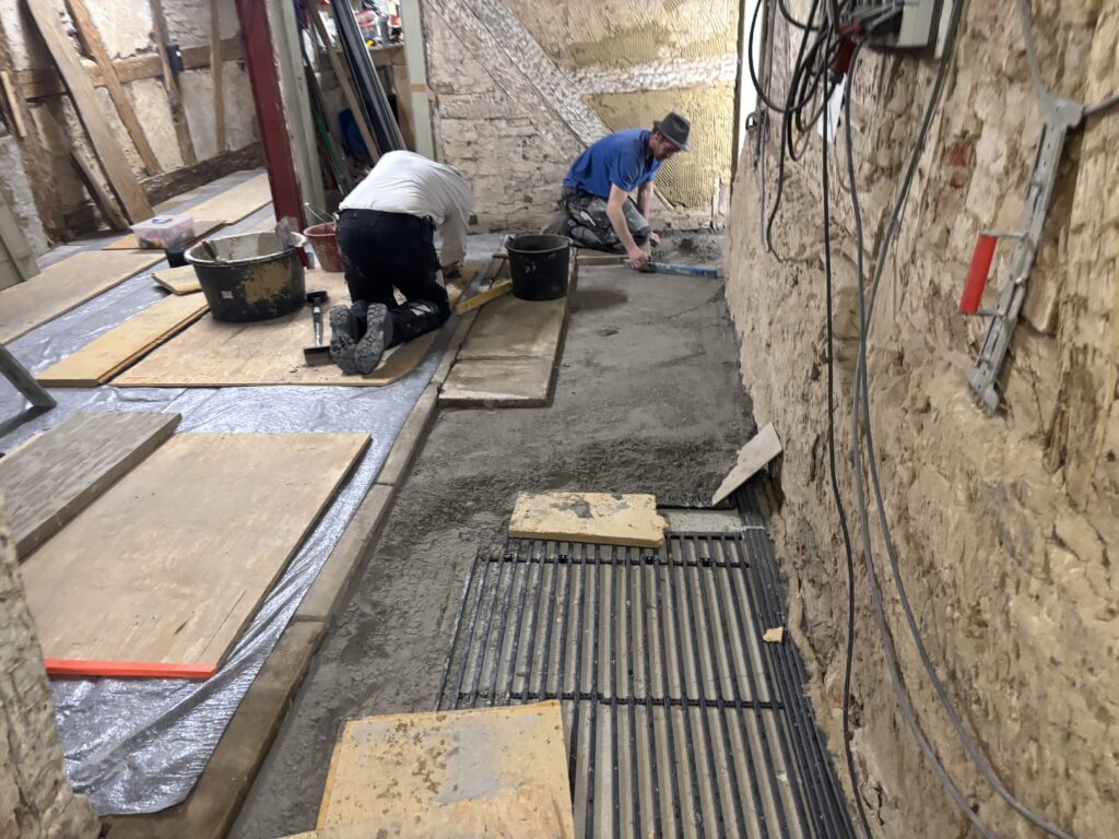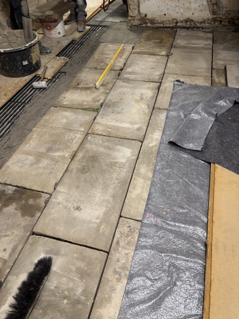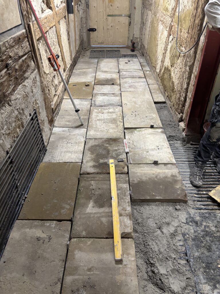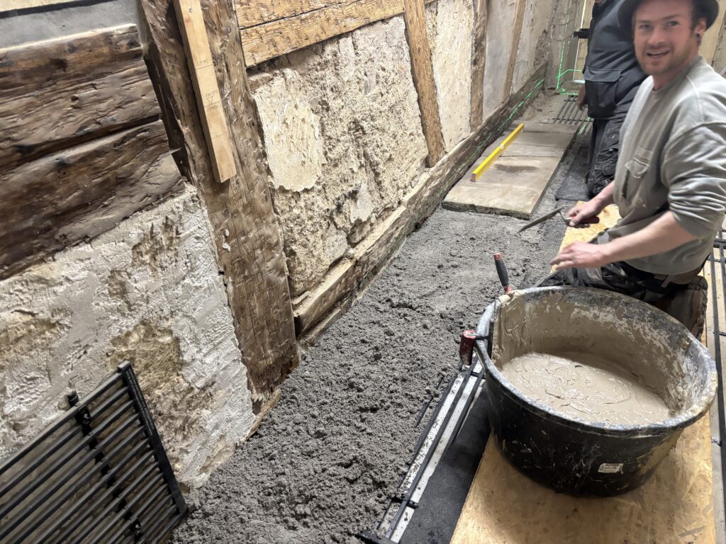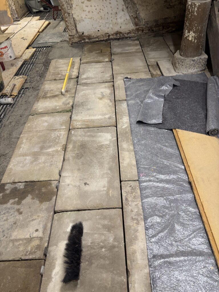 Von dort aus arbeiten die Beiden sich immer weiter vor bis der gesamte Flur wieder mit dem neuenalten Boden belegt ist. Nun fehlt nur noch das Verfugen.