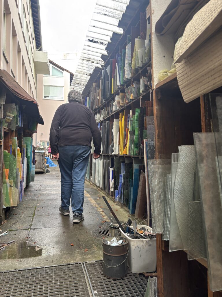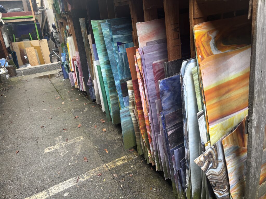 15.04.2025: Besuch im Glasatelier Saile in Stuttgart. Hier bekommen wir eine Führung durch das Atelier und historische Scheiben für unsere Fenster, die wir erhalten und aufarbeiten werden. Leider waren einige Scheiben defekt oder haben während der bisherigen Sanierung Schaden erlitten. Wie gut, dass es das Atelier Saile gibt, das im Fundus noch viele Schätze hat…