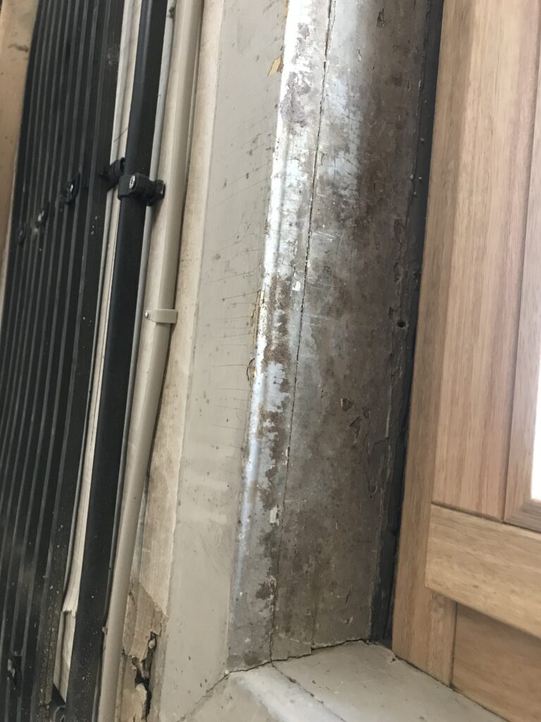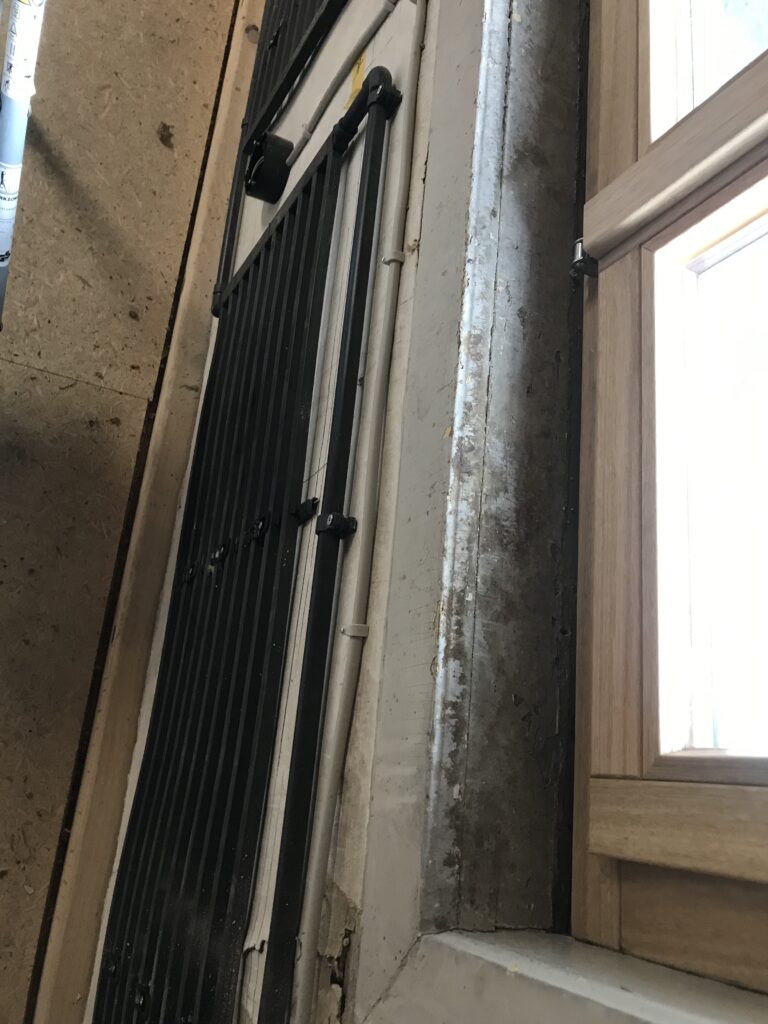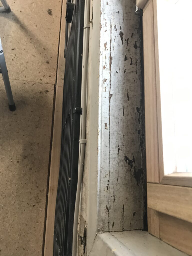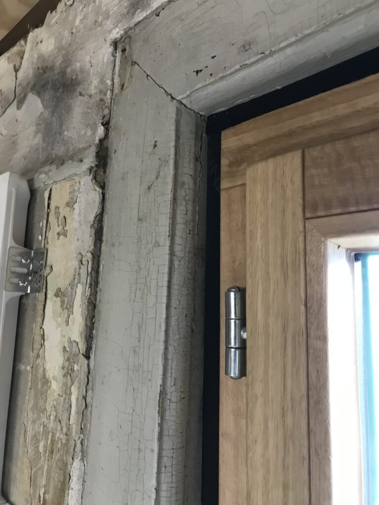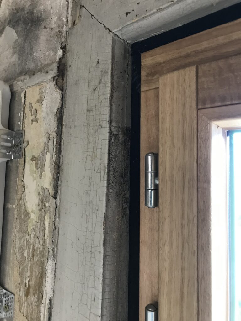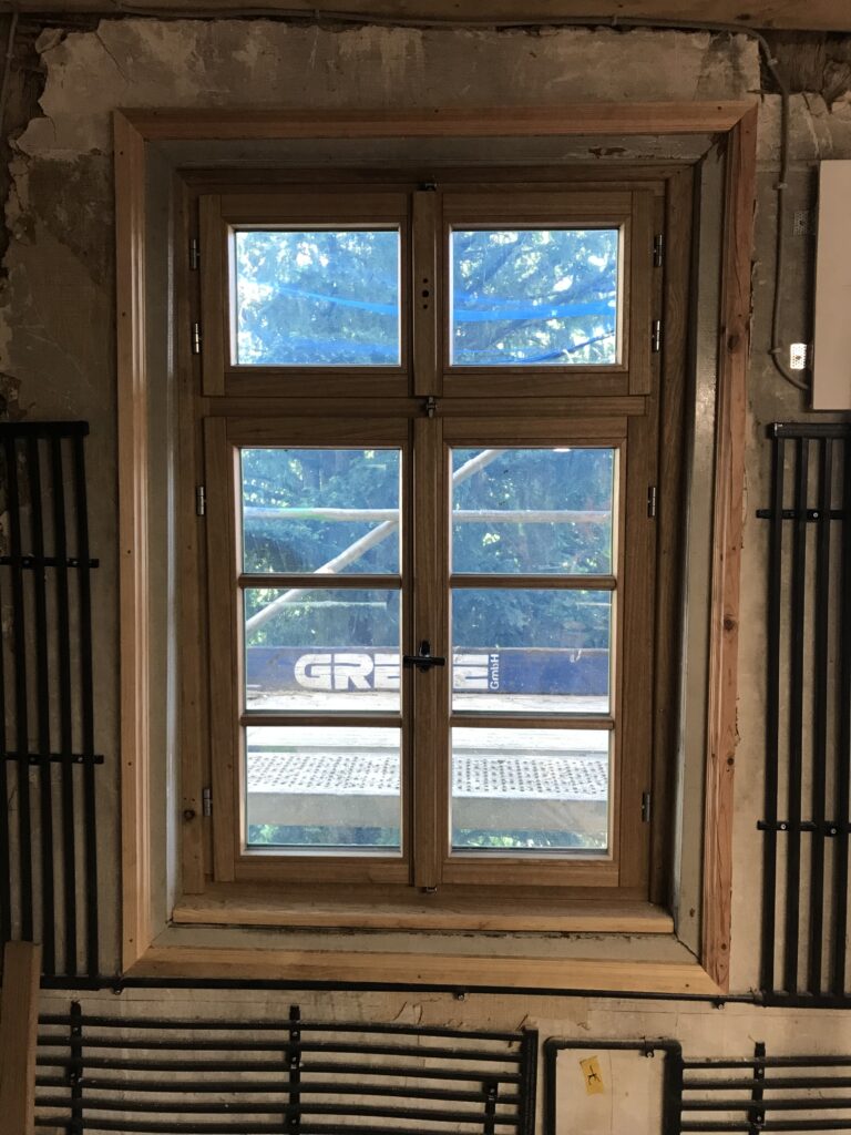 Es ist Anfang Mai 2025, Thilo fertigt gerade Leisten, die um die Fensterrahmen kommen um mit dem Oberputz direkt anschließen zu können. Da auf Wände teilweise Heizelemente aufgebracht oder Leuchten eingeputzt werden sollen wird die Wand innen etwas dicker. Der Anschluss vom Putz zum Fenster würde dann schwierig werden. Ich reinige inzwischen die Fensterrahmen. Es sind schon skurrile Anblicke hier – die Rahmen noch mit dem Schmutz der letzten Jahrzehnte und daneben die neuen frisch eingebauten Fenster.