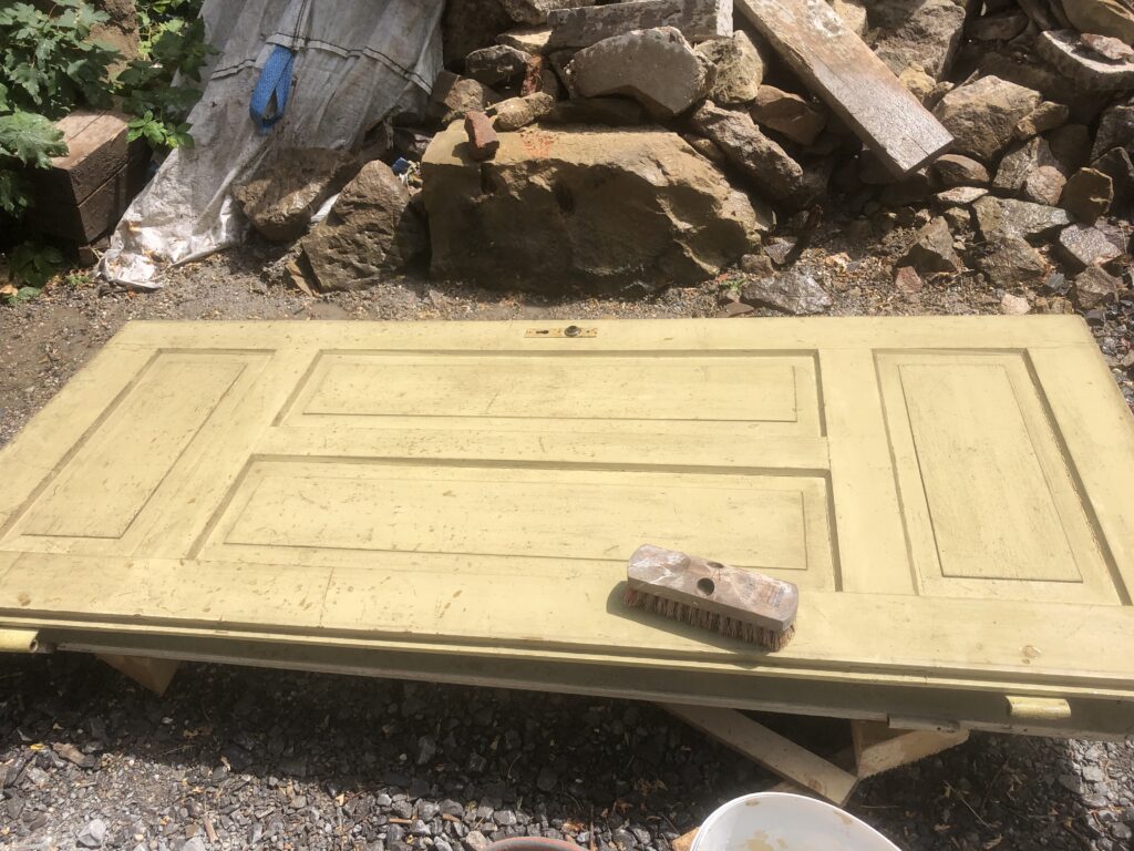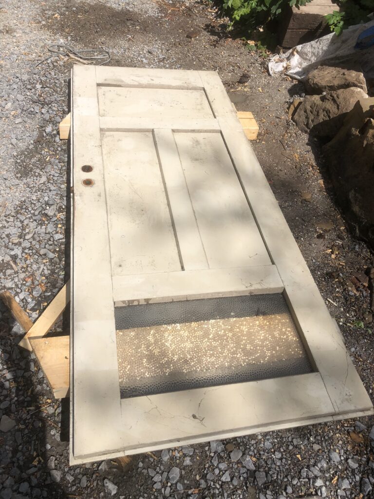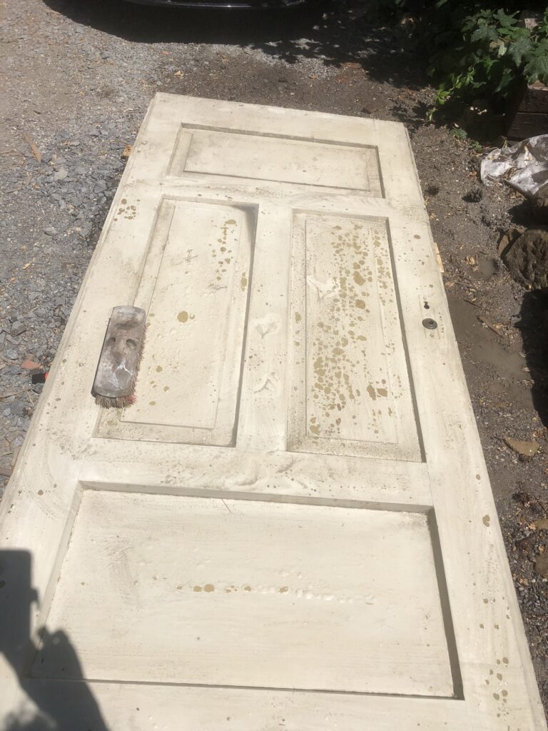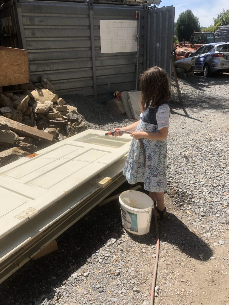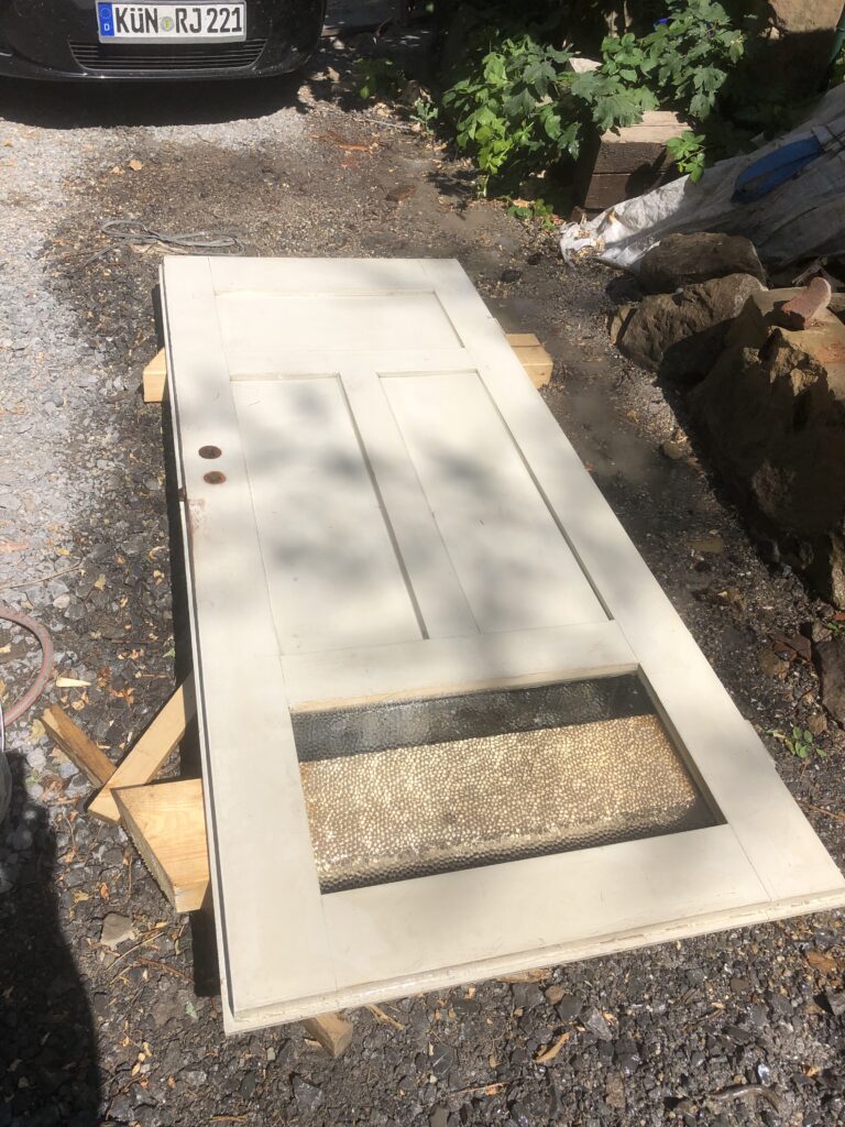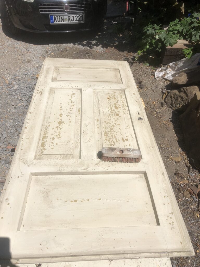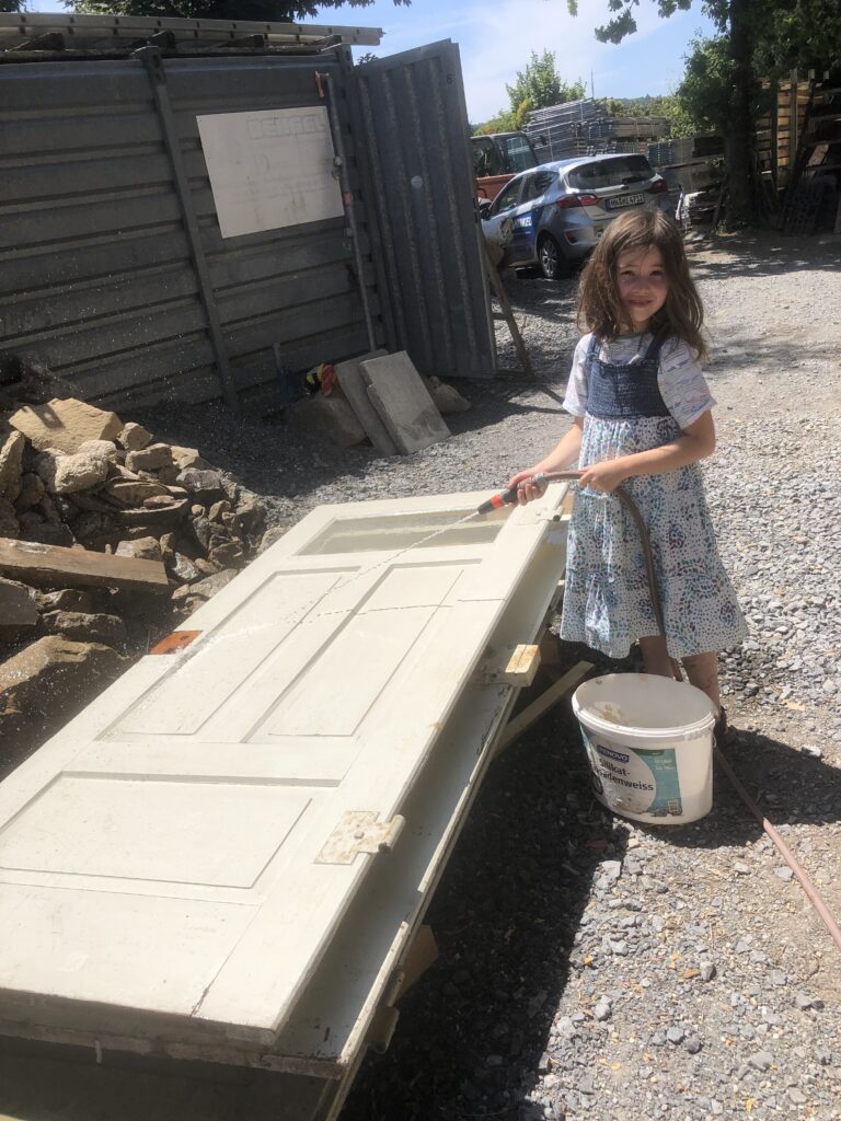 05.07.2025: die Türen und Fensterläden, die noch in einem Container gelagert wurden müssen raus, da der Container wieder abgeholt wird. Die Türen für die Mietwohnung im DG säubern wir gleich, da diese zuerst gerichtet werden.