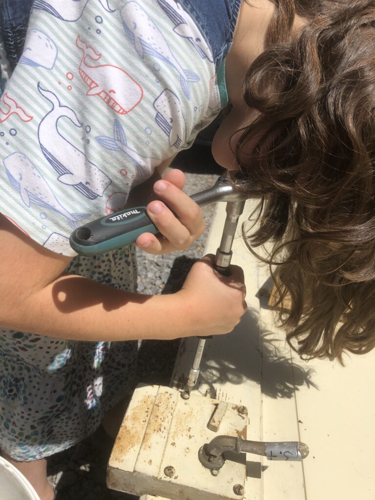 Edith hilft die Schlösser und Griffe abzumontieren.