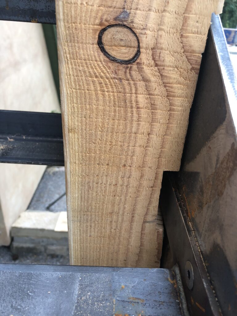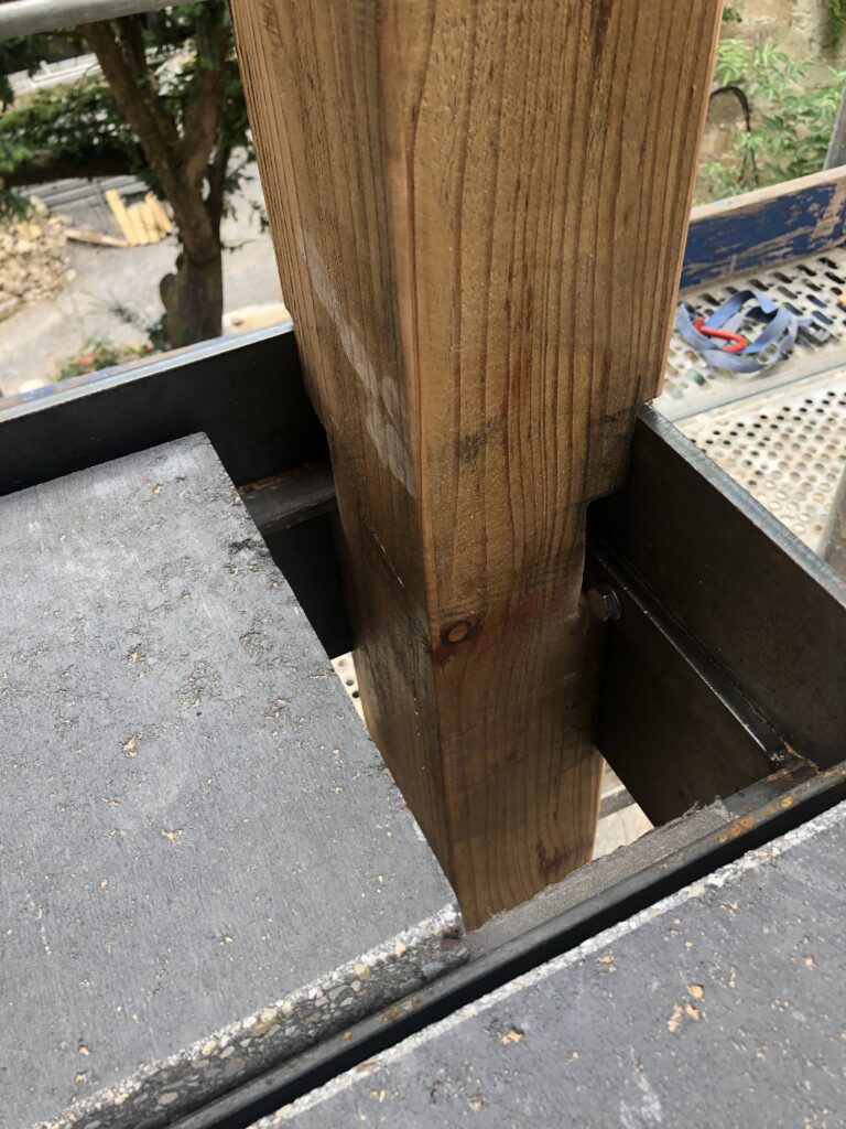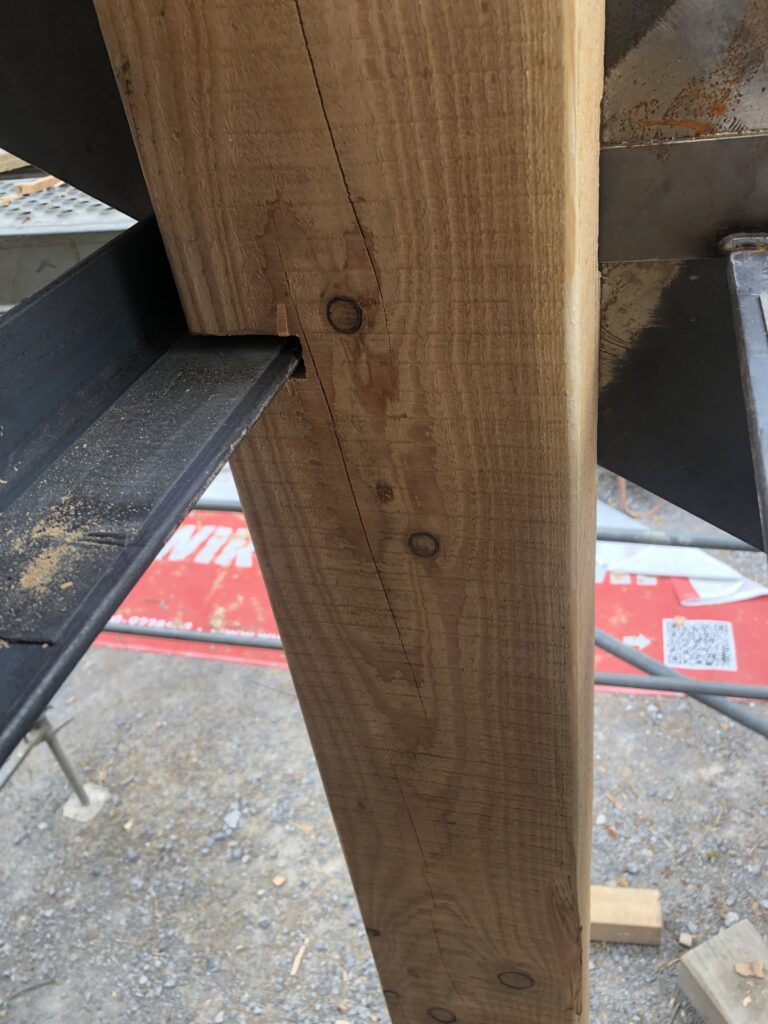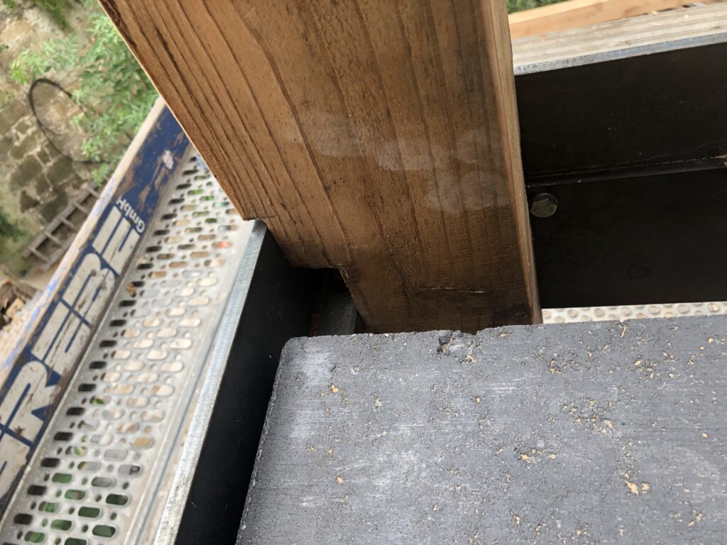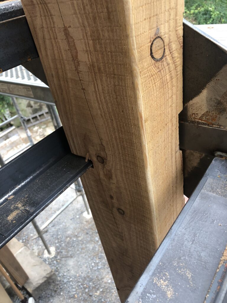 Noch stehen lange Sprieße um die Stahltreppe zu halten. Diese werden nun Stück für Stück durch lange exakt eingepasste massive Holzbalken ersetzt.