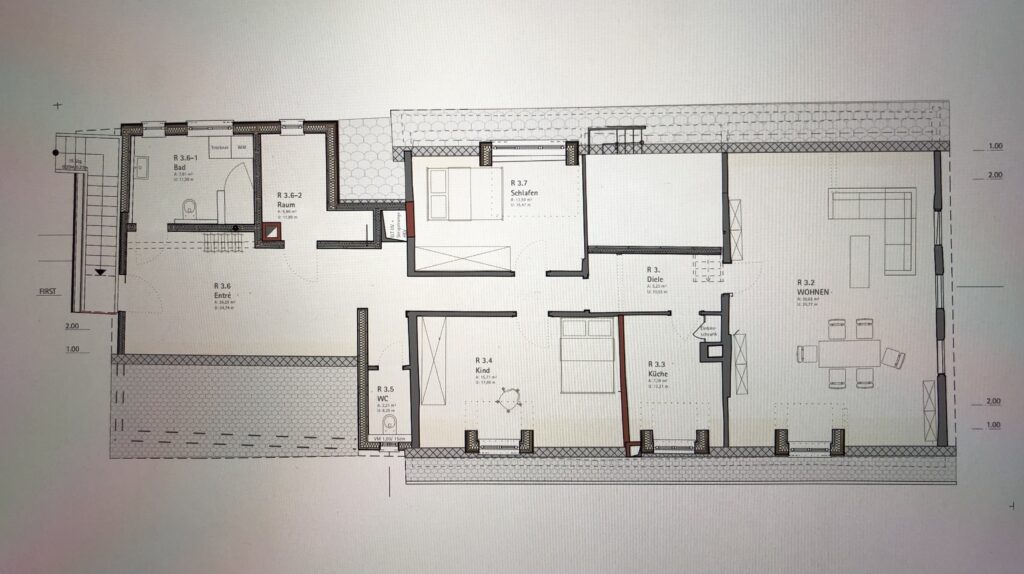 Der großzügige offene Eingangsbereich besticht durch die historischen Balken und ist bewußt so gestaltet, dass eine große Garderobe sowie Schuhkommoden ihren Platz finden.Die Wohnung verfügt über ein großes Wohn-Esszimmer, eine Küche (diese kann selbst mitgebracht werden), ein helles (Kinder)Zimmer, ein Schlafzimmer, ein Büro oder Abstellraum, ein großzügiges Bad mit ebenerdiger Dusche sowie eine Gästetoilette. Auf dem Grundstück gibt es einen Stellplatz und nach Absprache die Möglichkeit der Gartenmitnutzung.